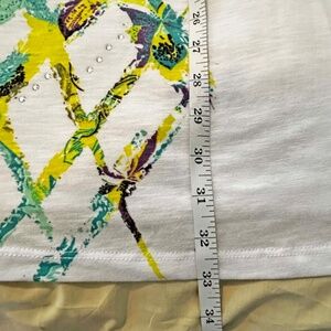 T-SHIRT, RUCHED NECK, WHITE WITH PRINT, SIZE 4X, GLASS SPARKLE ACCENTS, VEE NECK, LONG LENGTH, PENNINGTONS, IN ORIGINAL BAG, TAGS ON, NEVER WORN
