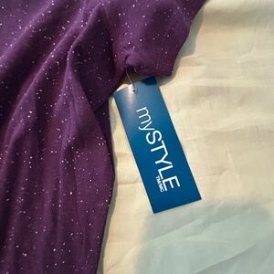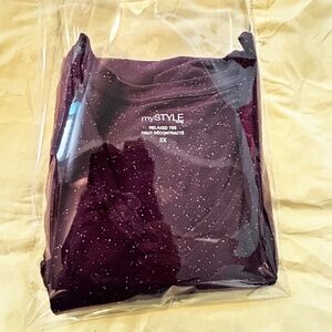 T-SHIRT, SHORT SLEEVE, PLUM WITH SMALL WHITE DOTS, SIZE 2X, VEE NECK, MY STYLE, IN BAG, TAG ON, NEVER WORN