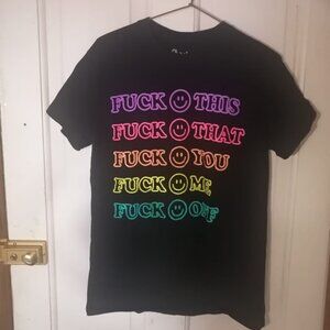 Black graphic tee with bold rainbow lettering and smiley face details 🌈