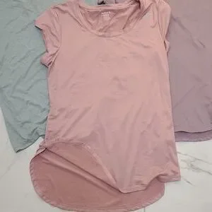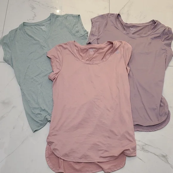 3 Reebok athletic wear t-shirts. I bought these, when I got home I didn't like the fit. purple and pink have a creamy soft feeling, and have side slits. Reflective Stripe on the back of all of them