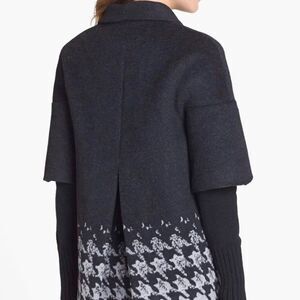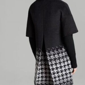 Casual houndstooth in an exploded scale wraps the bottom half of thoroughly contemporary coat. A slim shawl-collor tops the cleanly styled design , while short belled sleeves with long sweater knit inserts add dimension and textural contrast.