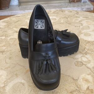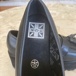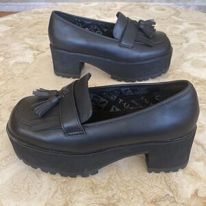 In excellent preowned condition, with barely any signs of wear, cool T.U.K. Black TUKskin™ Fringe Loafers with a substantial platform.