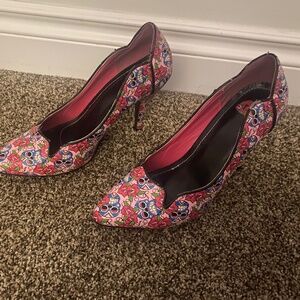 Skulls and flowers Size 8 Heels about 3 inches Some wear on the black outside lining