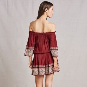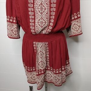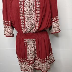 The Fiona Dress mixes a muted palette with a darling drop waist silhouette and off-the-shoulder styling. Also marked by delicate contrast embroidery this dress makes a statement when it comes to a complete boho look. In excellent condition.