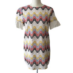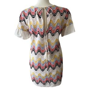 Patterned with embroidered zig zag waves in rainbow hues, this mini dress features a relaxed shape with peek-a-boo back detail.