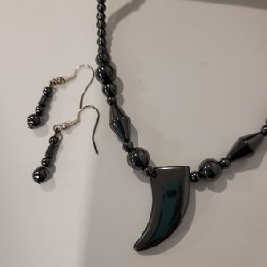 Tungsten wolfram beaded necklace with a horn / tooth shape pendant, barrel clasp, and beaded earrings set.