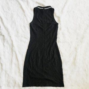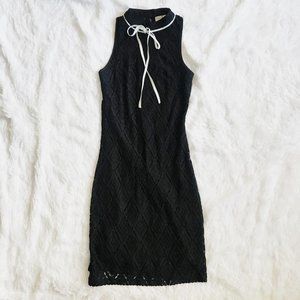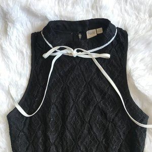 Adorable sleeveless little black dress with lace detailing and a white string collar.