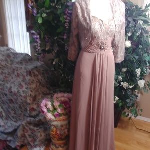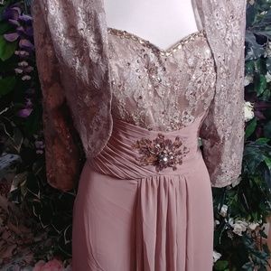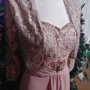 WOW! This gown is truly gorgeous. Made by Fiesta Sz M. It is light, airy flowing and is bejewelled at the waist. It has a lace bodice adorned with sequins and beads and has a bolero lace jacket. Wear it with or without the jacket. Perfect for that special occasion or wedding.