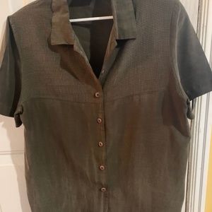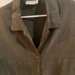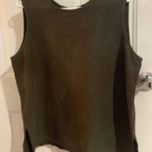 Very comfortable work suit. Lovely neutral moss/khaki tone with mix of a waffle/micro suede feel of patterned tone on tone design. Elastic waist skirt has 37” length nice side slit 13” for comfort sitting/driving. Tank top and over jacket short sleeves a very sharp set.