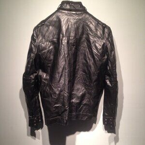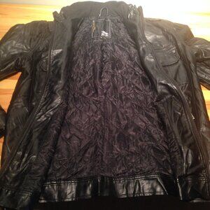 TXT faux leather jacket, black color, size Medium. The interior is lightly quilted. Four front pockets and one inside pocket. Collar with decorative fastener. The sleeves are adjustable thanks to the 2 snap closure positions. The zippers, as well as the snap buttons, all work very well.