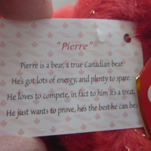 Beautiful, rare (2 tags - TY and Special Olympics) Special Olympics "Pierre" the Canadian TY Beanie Buddy (from a collection) - was a special order item direct from Special Olympics way back in early 2002. Comes with the Certificate of Authenticity from Special Olympics. This buddy stands approx 14" tall, and is a brilliant red color with gold speckles throughout. Buddies are larger than the Ty Beanie babies and are made with a material called Tylon, which is extremely soft, smooth and specifically designed to hold vibrant colors. Item is in brand new condition - has been tag-protected, stored in a cool/dry place, from a smoke-free home, and has never been played with. Has some "fur" wrinkles from storage, which should relax over time.