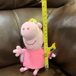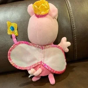 Soft pink TY Peppa Pig princess plush with wings and a crown. Bright yellow wand detail adds charm. Smooth plush fabric and embroidered features. Cute collectible for fans and imaginative play.