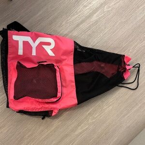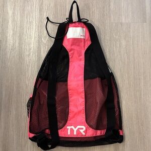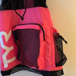 Stylish TYR backpack. Pink and black design. Mesh construction. Perfect for carrying essentials.