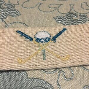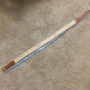 Good preowned vintage condition, cream coloured cloth/linen or cotton and cognac-brown leather belt with bronzish hardware by Tabi. There is some sort of tarnish/stain on the belt buckle that could be remedied with the right solution. Otherwise the belt is in good shape. Features little golfing applique/stitching in yellow, white and bright blue.