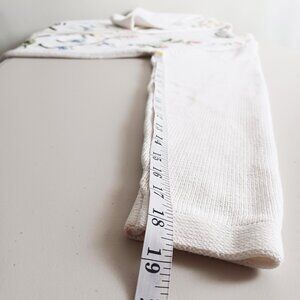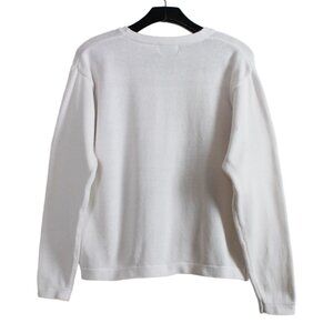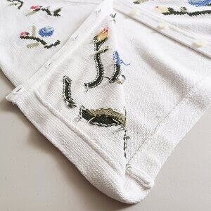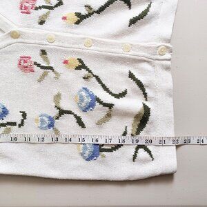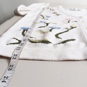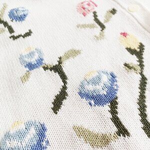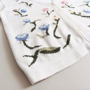 A classic button-down cardigan sweater in white with a floral motif integrated into the knit. Highlighting stylized flowers in red, pink, blue, yellow, and green. Made from medium-weight cotton knit with a gentle stretch. Perfect for spring, summer evenings, and early fall. Pre-loved vintage, in very good condition.