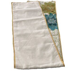 A creamy white background with green scrollwork and 3 dimensional flowers
