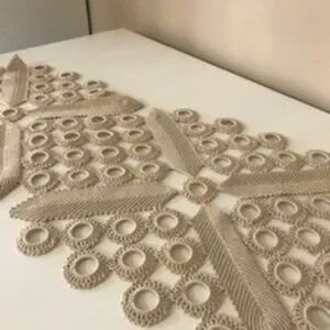 This is the most unique table runner - it can also be used on top of a table cloth if you want colour showing through the design. Cream colour with jagged edge. Size is approx. 68