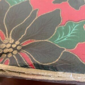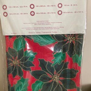 Tablecloth - Holiday Classic 60”x122” - Holiday Classic by Yongetex – 60 in x 122in – rectangular -seats 12-14 – 100% cotton - -generous size tablecloth - perma press soil release finish - threaded gold edge - brand new I still in original package – dark green poinsettia with green leaves and red background – package in excellent condition - giftable – smoke/pet free home