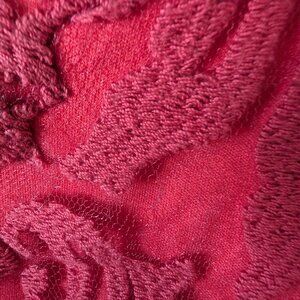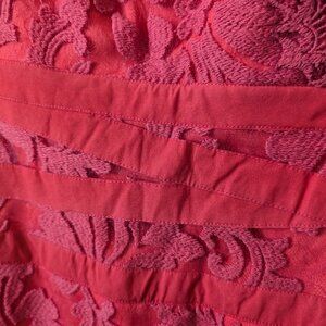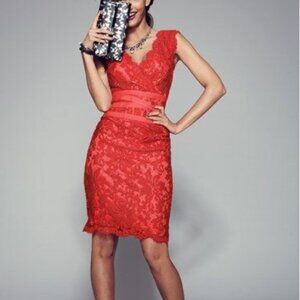 Elegant red lace dress. Features a fitted silhouette. Perfect for weddings.