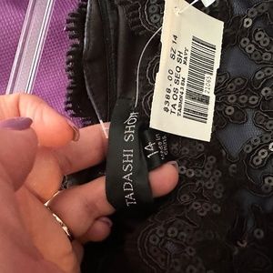 Tadashi Shoji sequins Lace dress, Navy Blue and Black. Never worn, new with tags. Sits above the knee, back zipper. Very comfortable and perfect for a formal event. Size 14US. Paid $398USD