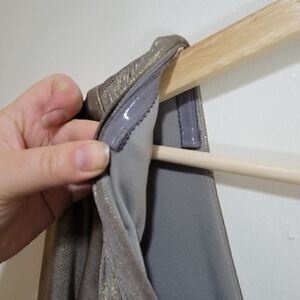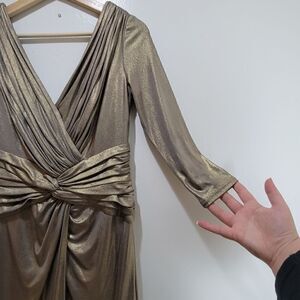 Stunning gilded antique gold color 3/4 length sleeve floor length maxi gown with a knot twist and gathered waist. Gathered drapes follow from shoulders down to bust also, and wrap around lower back in the rear. Read zip closure. Gray lining layer fabric. Silicon strip at shoulders to help stay in place as well as bra strap popper ties. Made in the USA. Excellent preloved condition. Fit for a Goddess.
