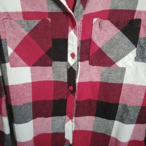 Soft and snuggly flannel checker plaid button down shirt. Classic flannel shirt look with two front pockets on chest, collar and rounded hemline.