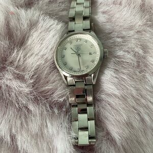 Tag Heuer Carrera ladies automatic watch . It’s a beautiful watch. I have received many compliments. Some scratches but none on the face . Please note that I do not have the papers or box . I do not have extra links . It fits my wrist at 6 inches. If you need additional photos I can definitely do that . This watch was gifted to me many years ago. It has a new battery..
