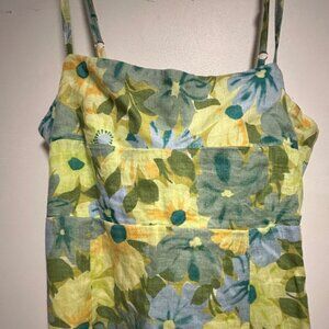 100% linen Lining: 100% rayon. Made in Indonesia. Hand wash. Fully lined. Hidden back zipper Back tie closure with smocked sides. Adjustable shoulder straps. Lightweight linen fabric with side seam slit.
