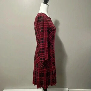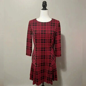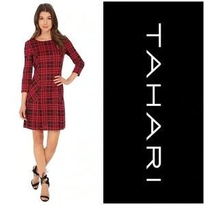Tahari ASL Levine Red Plaid 3/4 Sleeve Pleated Hem Drop Waist Dress