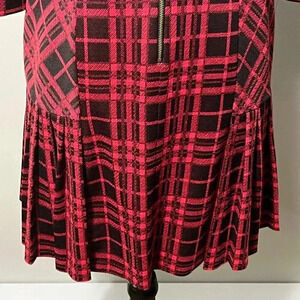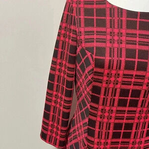 Excellent condition. Red & black plaid. Pleated hem. 3/4 sleeve. Rounded neckline. Lined. Gold back zipper opening.