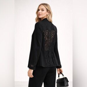 Sophisticated Tahari Arthur S. Levine blazer featuring a stunning lace back panel that elevates this classic silhouette into something truly special. From the front, it reads clean and tailored; from the back, it delivers a subtle, feminine statement with intricate lace detailing.
