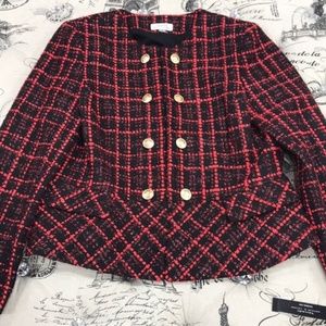 Tahari ASL brings a boucle plaid into the now with this sophisticated look, polished even more by shiny buttons