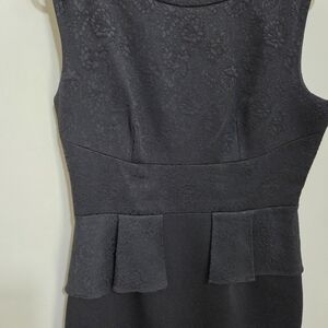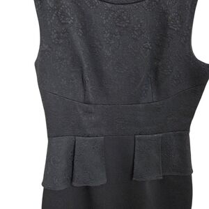 This stunning black dress by Tahari features a chic asymmetrical peplum detail that adds a modern twist to its classic sheath silhouette. Perfect for cocktail parties or a night out, it boasts a sleeveless design with a crew neck, offering a sleek and sophisticated look. The dress is crafted from a solid black fabric, ensuring a timeless and versatile addition to your wardrobe. Length 38" Bust 36"