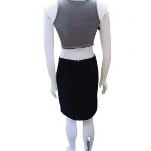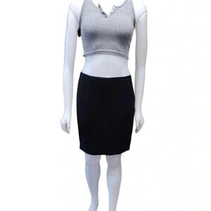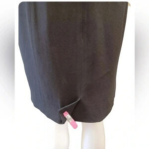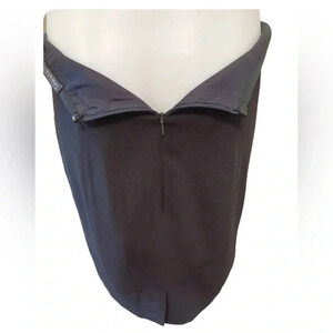 Black and fully lined, this mini features a zipper and clasp closure with a small slit in the back. Very little stretch available.