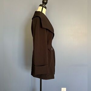Chic black trench coat with a wide collar. Features a belted waist for a tailored look.