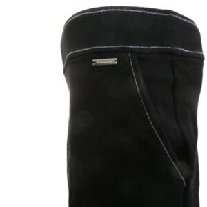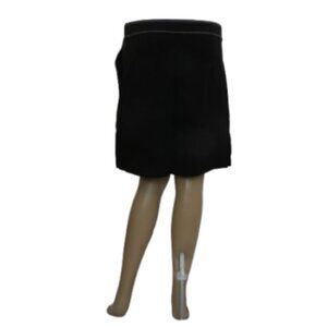 This sleek black knee-length skirt blends timeless structure with subtle statement detailing. Designed with two crisp lines of white contrast stitching running vertically down the front, it elongates the silhouette while adding a modern, tailored edge. Thoughtfully crafted with practical side pockets, it balances style and functionality effortlessly. A small logo tag on the front side lends a touch of branding without overpowering the minimalist design. Perfect for both casual wear and smart styling.