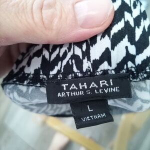 Stylish wide leg pants by Tahari. Features a black and white pattern. Comfortable and chic design.