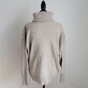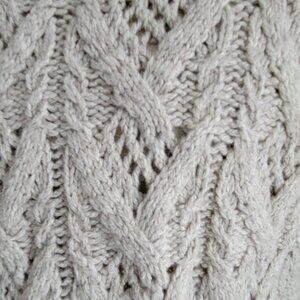 Blend of cotton/polyester, this sweater is SO soft. It has a beautiful cable knit pattern on the front and features a long ribbed hem and sleeve cuff.