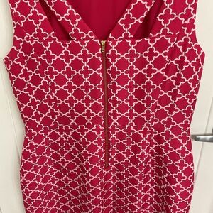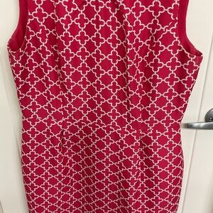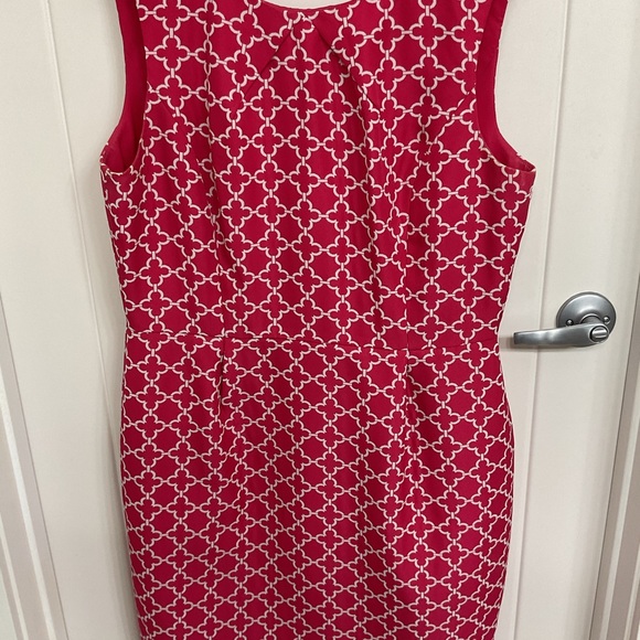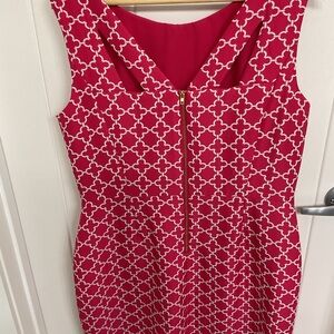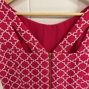 Elegant sleeveless dress featuring a striking hot pink and white pattern. Perfect for any occasion. Fully lined. Striking detailing on the back. Hits just at the knee And is designed to flatter.