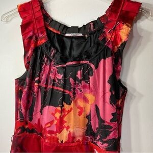 Tahari satiny ruffle neck sleeveless midi dress. Beautiful floral watercolour pattern in black red pink yellow. Dress claims to be size 14, but I measured it at more of a medium. Please check measurements. Special occasion, prom, spring summer bohemian lightweight flowy dress