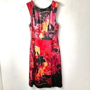 Tahari Dress Red Black Pink Satin Floral Ruffle Satin Size M