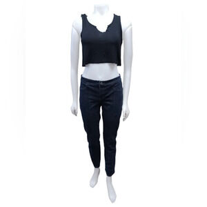 Dark wash denim, these jeans feature a button and zipper closure and offer considerable stretch.