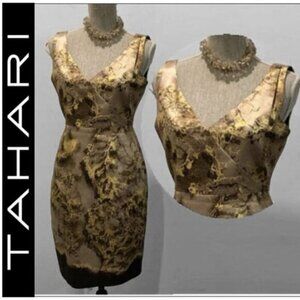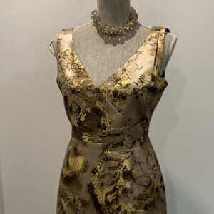 TAHARI METALLIC ABSTRACT SLEEVELESS SHEATH DRESS IN BROWN & GOLD