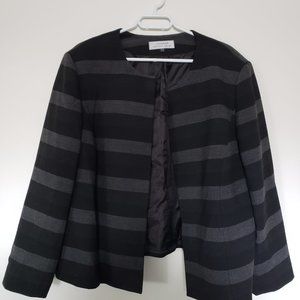 A stunning, lightly worn grey and black suite jacket. Very smart looking and looks amazing with a bright pair or pants or skirt. 100% polyester.