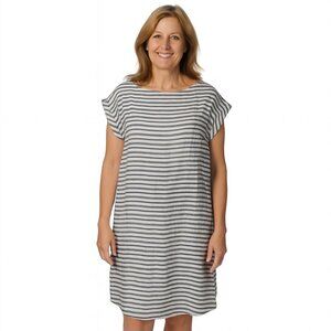 Breezy and polished, this Tahari linen midi dress in size small features crisp blue and white stripes and a sleeveless design perfect for warm weather. With a breathable feel and classic silhouette, it’s ideal for summer events, vacations, or everyday style.