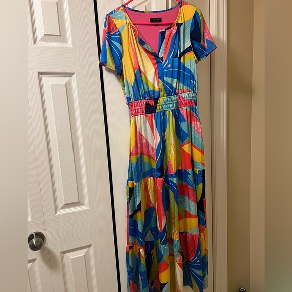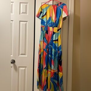 Bold and vibrant maxi dress. Features a mix of blue, pink, and yellow. Perfect for making a statement.