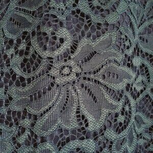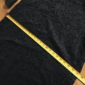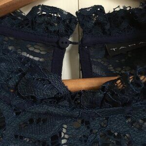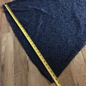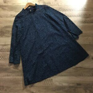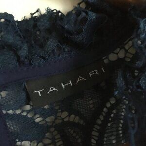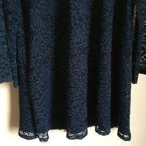 Excellent preowned condition navy-blue (almost royal blue) lacy, bell-sleeved oversized dress by Tahari. Has a sort of baby-doll fit and be paired with a belt to achieve more shape. Tiny keyhole at nape of neck with a button closure. Very cute. Perfect for the holidays or any festive occasion.