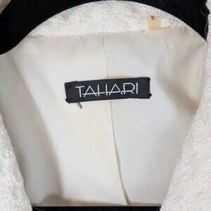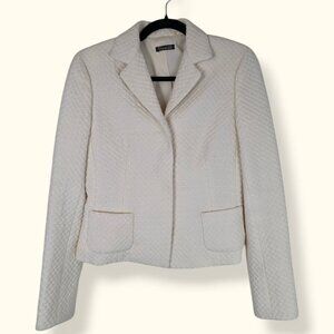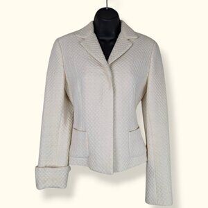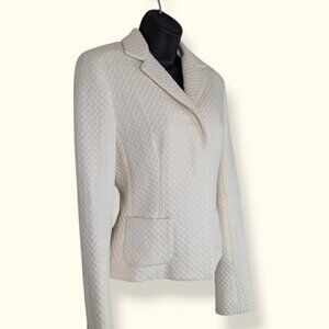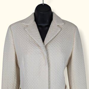 This coat by Tahari is made of a wool/acrylic blend (50/50) and has a beautiful, small round florette-like pattern in the knit. The coat has a hidden front snap closure, 2 front pockets, white lining, padded shoulders, and slits in the cuffs that allow them to be rolled up (see picture 4). The structure of the piece is well made and there are great darts in the back that help improve the fit. The piece has normal wear but nothing that affects wearability.