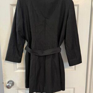Charcoal/ black long blazer. Fully lined, belt is lined, subtle ribbon ruffle at collar. In almost new condition. Size medium with measurements in photos. This coat feels and looks quality.