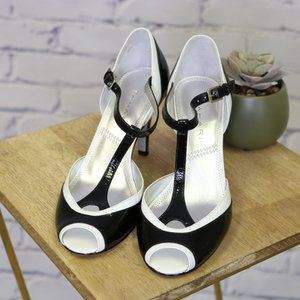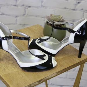 In great condition! The straps look a little wonky, but they will look normal when you're actually wearing them. 3.5 inches high.